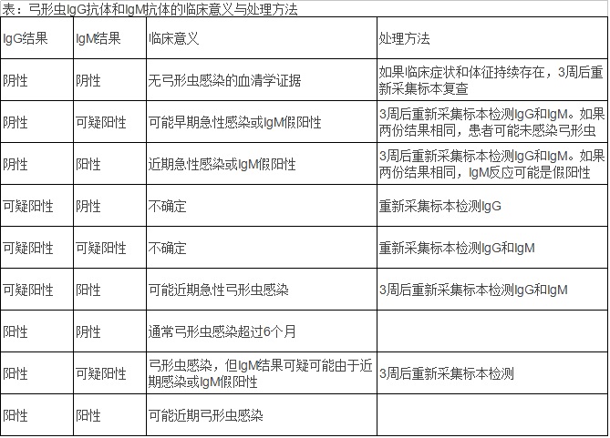 | 弓形虫抗体IgM | 先天感染是不良妊娠发生的重要原因,可引起流产、早产、胎儿宫内死亡和各种先天畸形胎儿。IgM阳性提示可能为急性期感染火近期感染。IgG阳性提示可能为既往感染或急性感染后期【参照表】 | ||
